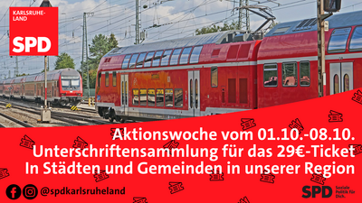 Die SPD wird deshalb in einer Aktionswoche vom 1. bis 8. Oktober in vielen Städten und Gemeinden im ganzen Landkreis präsent sein. Ziel ist es, auf den lokalen Marktplätzen mit Bürgerinnen und Bürgern ins Gespräch zu kommen und Unterschriften für eine Fortführung des bezahlbaren ÖPNV durch ein 29€-Ticket zu sammeln. Auf diese Weise möchte die SPD Karlsruhe-Land den Druck auf die Landesregierung in Baden-Württemberg erhöhen, damit diese ihre Verantwortung wahrnimmt und sich an einem sozialen und nachhaltigen Nachfolgeticket beteiligt.