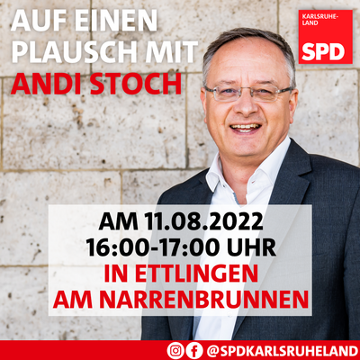 Andreas Stoch hört zu und packt an! Unser Landes- und Fraktionsvorsitzende der SPD Baden-Württemberg und ehemalige Kultusminister kommt im Rahmen seiner Sommertour am Donnerstag, 11.08.2022 von 16:00-17:00 Uhr nach Ettlingen. An möglichen (Landes-)Themen zum Austausch mangelt es aktuell bei Weitem nicht. Sei es beispielsweise der Unterssuchungsausschuss um die Affäre unseres Innenministers Thomas Strobl, die Freistellung von Lehrkräften über den Sommer oder die notwendige Verbesserung des ÖPNVs, insbesondere nach dem Auslaufen des 9-Euro Tickets! Lasst euch diese Chance nicht entgehen und kommt nach Ettlingen! Informiert euch aus erster Hand direkt bei einem netten Gespräch am Narrenbrunnen mit Andreas Stoch über aktuelle Themen, die euch beschäftigen! Wir hören zu und packen es an!