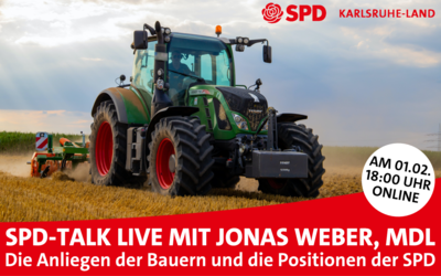 am Donnerstag, den 1. Februar, um 18:00 Uhr, findet unser Online-Diskussionsformat "SPD-Talk Live" zusammen mit dem Landtagsabgeordneten Jonas Weber statt. Jonas Weber stellt sich Euren Fragen zum Thema "Die Anliegen der Bauern und die Positionen der SPD". Alle Interessierten sind herzlich dazu eingeladen, an der Veranstaltung teilzunehmen und sich aktiv einzubringen.