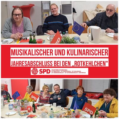 Zur letzten Singstunde 2024 ließen es sich dir "Rotkehlchen" bei süßen und herzhaften Leckereien im "Roten Eck" gut gehen. Neben politischen Gesprächen über das Bürgergeld, Integration und den kommunalen Haushalt kam das gemeinsame Plaudern und Lachen nicht zu kurz. Gesungen wurde natürlich auch. Besonders beliebt waren diesmal "Brüder, zur Sonne, zur Freiheit" und "Gute Nacht, Freunde".