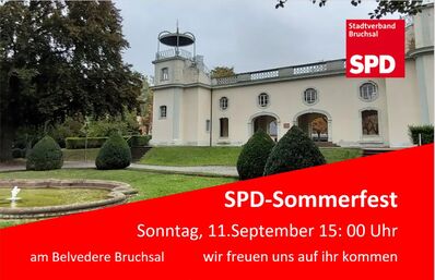 die SPD Bruchsal lädt zu ihrem traditionellen Sommerfest am Sonntag, den 11.9.22 ab 15:00 Uhr auf den Platz beim Belvedere Bruchsal ein.