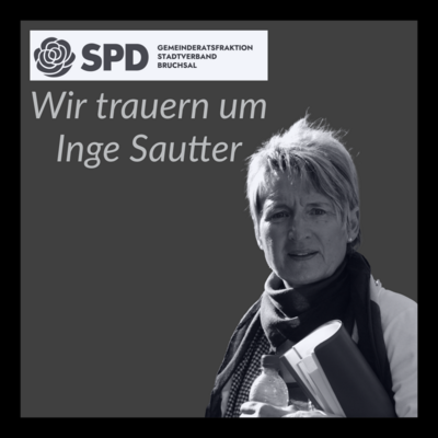Inge Sautter ist tot. Wir, der SPD-Stadtverband Bruchsal und die SPD-Gemeinderatsfraktion, sind bestürzt von dieser Nachricht. Inge Sautter gab jahrzehntelang unseren SPD-Grundwerten Freiheit, Gerechtigkeit und Solidarität Gesicht und Stimme. In ihrem Wohnort Helmsheim war immer klar: Wo Inge ist, ist auch die SPD. Engagiert, klar in Sprache und Haltung und immer am Gemeinwohl interessiert – so erlebte man Inge Sautter. Nicht nur, aber besonders in Helmsheim.
